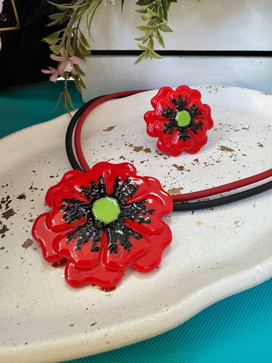 Любите ли вы маки так же, как любим их мы? Этот яркий комплект муранских украшений - колье и кольцо - словно распустившийся летний луг прямо