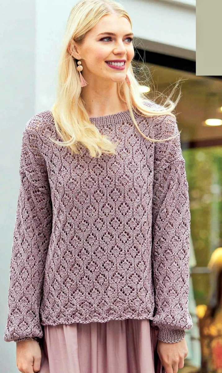 Затем все петли закрыть лицевыми. Временно оставленные по 30 п. рукавов перевести на короткие круговые спицы, для этого с другой стороны цепочки из в. п. набрать по 15 п. и на всех 45 п. вязать ажурным узором.