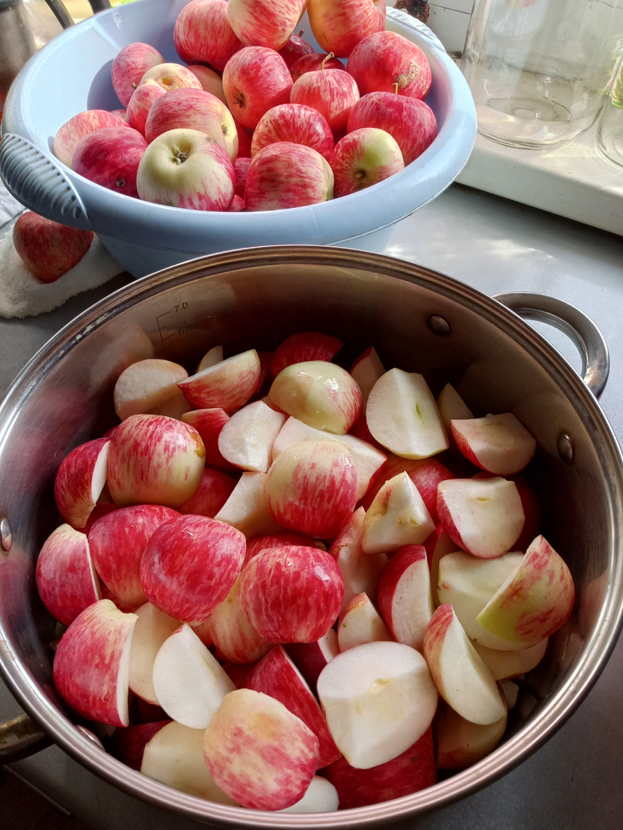Так вот, банки подготовлены, крышки прокипятила. Пора приступать к приготовлению яблок. Шкурки я не чищу, так как в них пектина больше, чем в самом яблоке. А он мне нужен для загустения. Помыла яблочки, порезала их на 4 части и обрезала сердцевинки. Детям тоже на еду яблочек оставила.