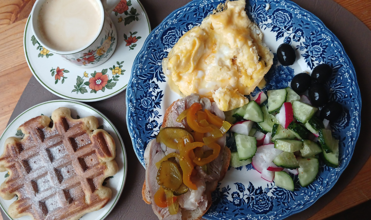 Сегодня к завтраку скрэмбл, овощной салат, маслины, бутерброды с пастромой из индейки и огурчиками как в Маке. Чашка кофе эспрессо с бельгийской вафлей
