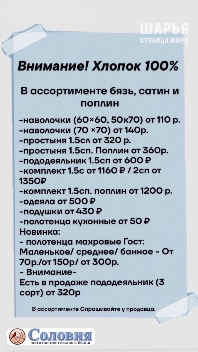 ‼️ Шарья и ВСЕ-ВСЕ-ВСЕ: ТОЛЬКО 24 августа (воскресенье) с 9.00 до 13.00 состоится распродажа постельного белья от интернет - магазина «Соловия» | Иваново | Место проведения: территория центрального рынка (ул. Чапаева) Шарья Так же присутствуют семейные, евро, люкс комплекты. Спешите и не опаздывайте-количество товара по акции ограничено‼️ Шарья – столица мира Крупнейшее городское СМИ Источник