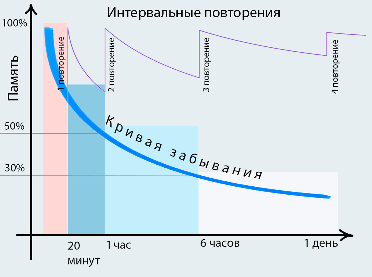 1. Кривая забывания Эббингауза (Ebbinghaus’s Forgetting Curve): при отсутствии повторений воспоминания быстро угасают — взрослый человек может забыть около 50 % информации всего через один час, и примерно 70 % — через сутки после первоначального изучения.