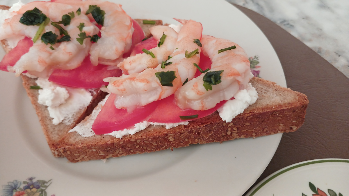 В качестве основного блюда сварила овсяную кашу, уже несколько дней ее не было в меню. К каше добавила кокосовый урбеч и манго. С креветками сделала бутерброды с творожным сыром и помидорами.