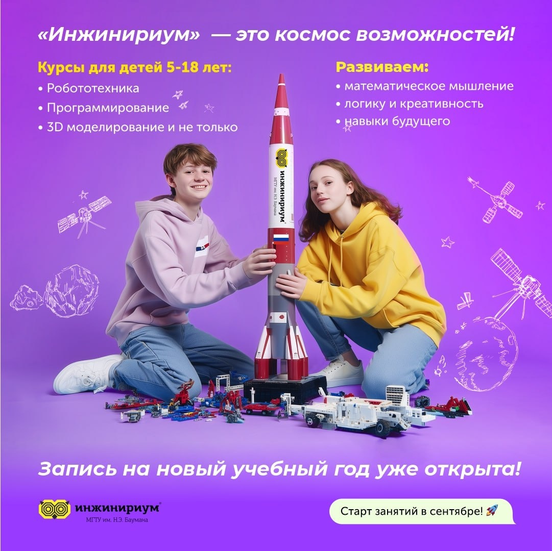 «Инжинириум»: взлет уже скоро! Первые занятия в «Инжинириум МГТУ им. Н.Э. Баумана» стартуют уже 6 сентября🚀 — и это шанс для вашего ребенка стать частью команды будущего! ✨ Наши направления открывают целые миры: • Робототехника — проектируем механизмы, которые работают в реальности • Программирование — создаем код, управляющий технологиями • 3D-моделирование — превращаем идеи в реальные объекты • Биотехнологии — изучаем тайны живых систем • Искусственный интеллект — осваиваем инструмент завтрашнего дня 👩🚀 Занятия ведут эксперты-практики, которые вдохновляют и помогают детям уверенно делать шаги в мир науки и технологий. ⚡️ Запись идет полным ходом, и свободные места в группах быстро заканчиваются. 📍 Химки, пр-кт Мельникова, д.16 📞 +7 (499) 495-25-01 🌐 inginirium-khimki.ru 📧 info@inginirium-khimki.ru Давайте вместе откроем космос возможностей для вашего ребенка! 🌟