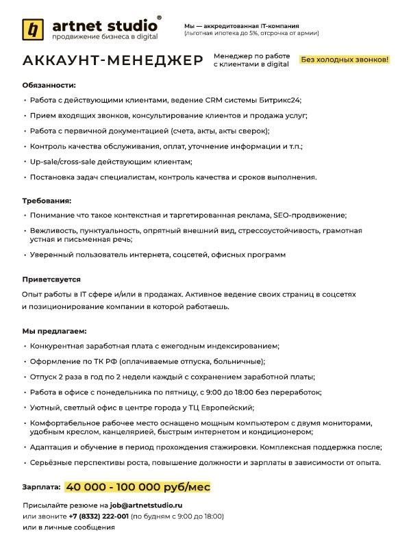 Высылай резюме: ✉ job@artnetstudio.ru или 💬 в личку.