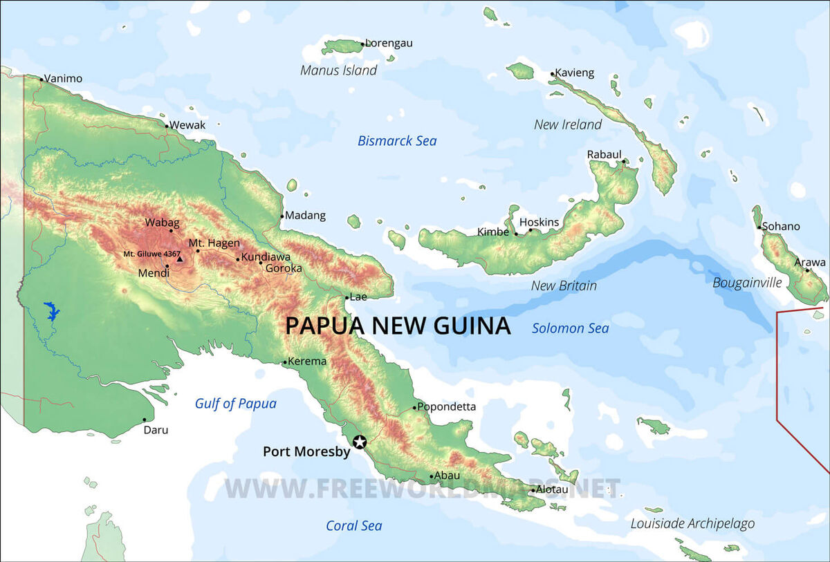 Папуа – Новая Гвинея – полное название Независимое Государство Папуа Новая Гвинея, находится в Океании, расположено в юго-западной части Тихого океана, занимает восточную часть острова Новая Гвинея, архипелаг Бисмарка и ряд островов. Население около 11 миллионов человек. Столица Порт-Морсби. Конституционная монархия. Исполнительную власть возглавляет премьер-министр. Законодательный орган – Национальный парламент. Официальные языки: английский, ток-писин и хири-моту. Большая часть населения – христиане, остальные придерживаются местных традиционных верований.