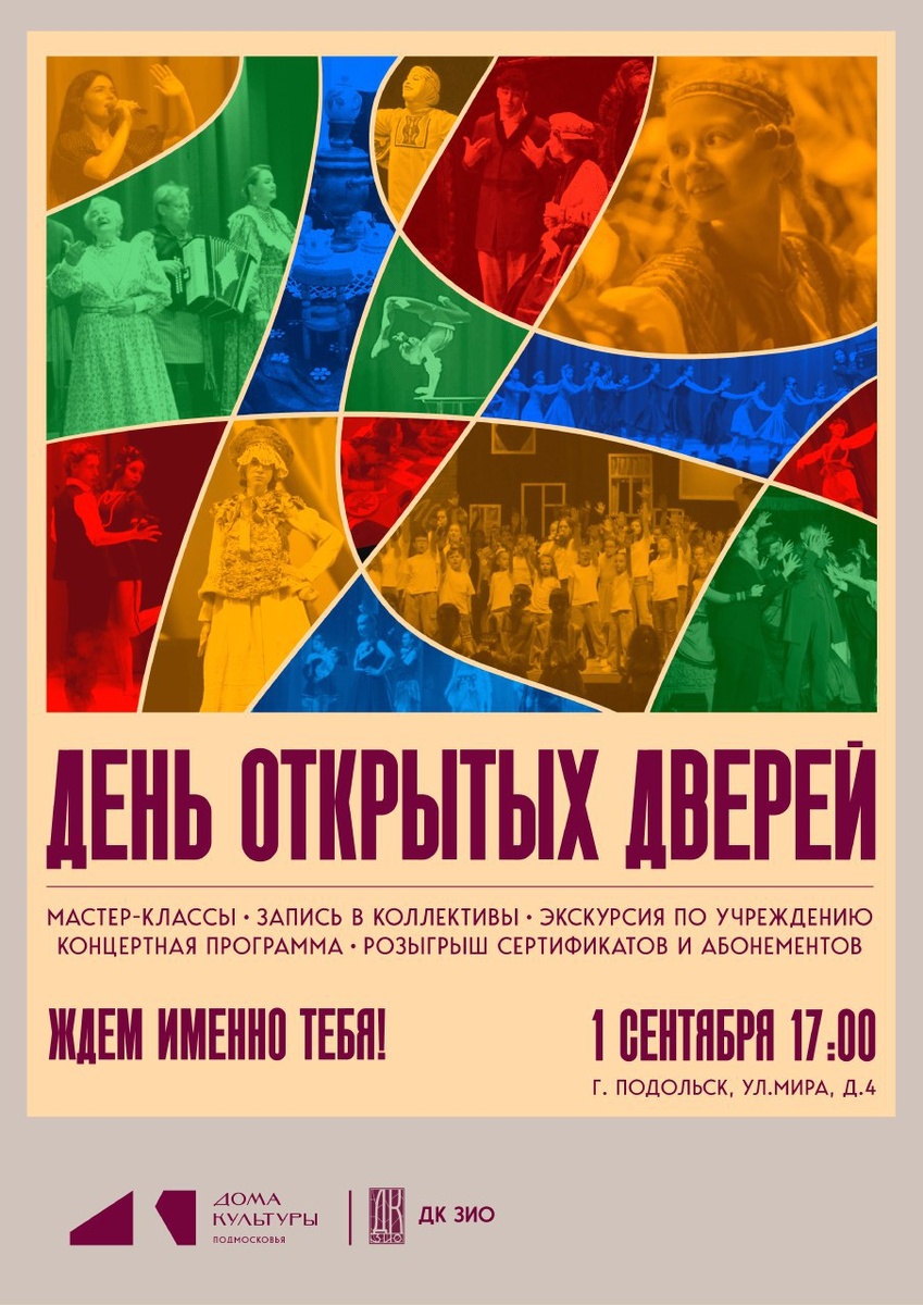 ✨ День открытых дверей в ДК ЗИО! В программе: 🔸Знакомство с кружками и студиями. 🔸Живое общение с руководителями. 🔸Пробные мастер-классы. 🔸Запись в коллективы. 🔸Концерт и экскурсия. 📌 Розыгрыш призов: сертификатов и абонементов! 📆 01.09.2025 🕒 17:00 🏢 ДК ЗИО 📍 г. Подольск, ул. Мира, 4 💰 Вход свободный❗️ #webПодольск ⭐Разместить публикацию ⭐Поддержать канал голосом 💰 Стань курьером в Подольске – твой доход, твое время! ✅ Мероприятия Подольск https://dzen.ru/id/66ed500f7b5671493eca3fd6 http://vk.com/podolsk_events http://dzen.ru/podolsk_events