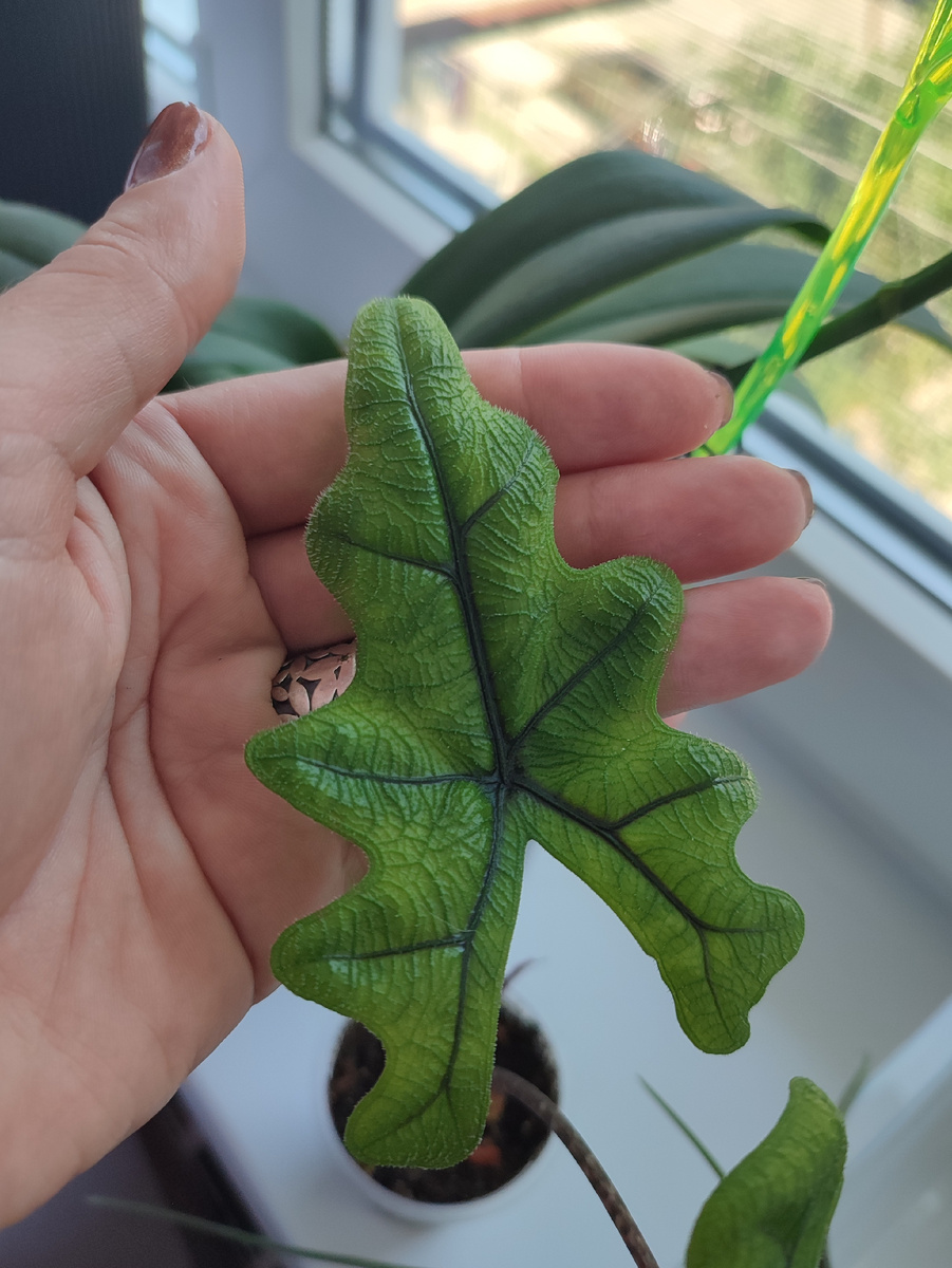 Ворвусь в этот субботний летний день с хорошей новостью! Моя Алоказия Жаклин выжила, выправилась и теперь в полном порядке 👌 Помните, у нее были какие-то проблемы с точкой роста, то лист не может раскрутить, то уродца выродит... Я подробно писала об этом с разбором моих предполагаемых ошибок в уходе, которые могли к этому привести, и рассказывала, как я эти ошибки исправляла. И сработало! Жаклин выдала здоровый красивый лист по сорту, причем сделала все сама! Вот так она выглядит сегодня. Ещё жив тот листик, который стал единственным после того, как точка роста была сломана, виден уродец, родившийся после этого, ну и новенький красавчик. Три листа, 2 из которых уже с признаками старения... И я очень рада этому результату, ведь я уже морально простилась с этим сортом. Посмотрите, как красиво она смотрится на моей пёстрой полянке 😍 Даже без орхидеи всё весьма разноцветненько, все как я люблю! Всё-таки листья - моя любовь навеки! Я была, есть и наверняка буду и дальше, поклонницей деко