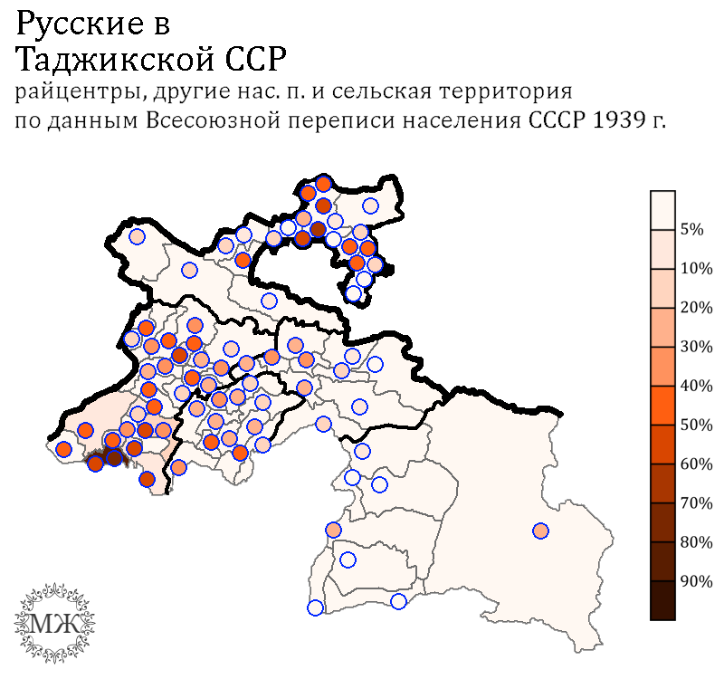 Изначально, не ожидаешь увидеть существенное присутствие русских в сельской местности на юге в Средней Азии, но среди южных республик доля сельского населения здесь самая большая - 31,3%, т. е. почти каждый третий был сельским жителем. Мы видим сельское присутствие в районах юго-запада, но в целом у русских был даже целый район с их абсолютным большинством - в Молотовабадском районе Сталинабадской области русские без райцентра составляли 81,3% населения. Район небольшой и речь идёт о менее чем 5 тыс. человек, которые оказались там по разным причинам - это и спецпоселенцы-крестьяне, и приток рабочих рук на Вахшскую долину специальным решением Политбюро. Собственно и сам район был образован с целью административного обособления этих территорий. В центре района Молотовабаде (ныне Дусти) также самая большая доля русских среди всех поселений Таджикской ССР - 77,7%. Среди областных центров, русские составили большинство только в центре Сталинабадской области и всей республики Сталинабаде (ныне Душанбе) - 57%.