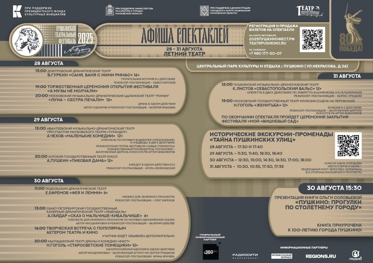 💥Одно из крупнейших летних событий Московского региона пройдёт на сцене Летнего театра в Центральном парке культуры и отдыха в Пушкино с 28 по 31 августа! 🎭На Пушкинском театральном фестивале зрителей ожидает обширная программа. Церемония открытия «А музы не молчали» пройдёт 28 августа в 19:00 и будет посвящена артистам фронтовых театров, артистам-подпольщикам, артистам, воевавшим во время Великой Отечественной войны. ✨Пушкинский театральный фестиваль пройдет при поддержке Президентского фонда культурных инициатив, Министерства культуры и туризма Московской области и администрации Городского округа Пушкинский. @pushkinomedia
