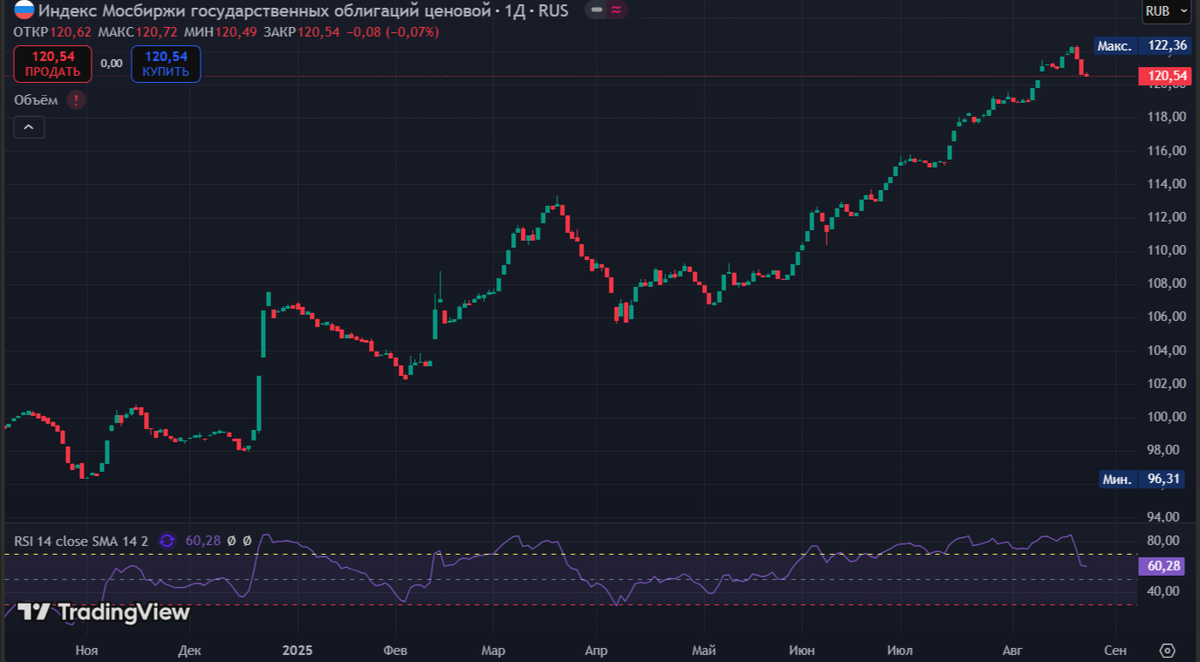 Минфин провёл аукцион ОФЗ, предложив инвесторам два выпуска. При его проведении индекс RGBI находился выше 121 пунктов, но с учётом застопорившихся переговоров (что странно, на повестке 5 дефляционная неделя подряд) индекс снизился до 120,54 пункта: 🔔 По данным Росстата, за период с 12 по 18 августа ИПЦ снизился на -0,04% (прошлые недели — -0,08%, -0,13%), с начала месяца -0,19%, с начала года — 4,16% (годовая — 8,49%). Темпы августа продолжают удивлять в хорошем смысле, у нас 5 подряд дефляционная неделя, не зря же Центробанк снизил прогноз инфляции на этот год до 6-7% (было 7-8%) и среднего значения ставки до конца года до 16,3-18% (ставку до конца года могут оставить без изменений или снизить до 14%, с учётом дефляционных недель вполне правдоподобно). Но опрос инФОМ в августе показал, что ожидаемая инфляция увеличилась с 13 до 13,5%, а наблюдаемая с 15 до 16,1%. 🔔 Минфин планирует занять в 2025 г. 4,781₽ трлн (погашения — 1,416₽ трлн), сумма рекордная с начала пандемии и выше, чем
