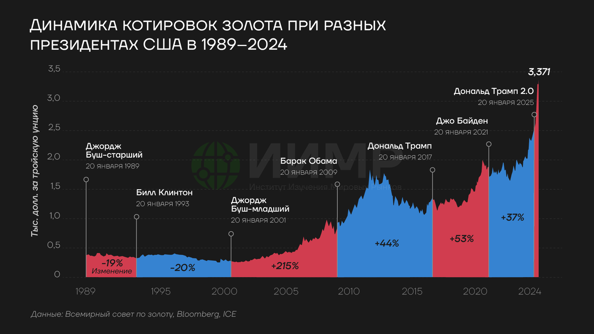 В XXI веке котировки золота при каждом последующем президенте США стремились к новым максимумам. С момента начала президентства Джорджа Буша-младшего в январе 2000 года к началу второго президентства Трампа в январе 2025 года котировки золота выросли в 10 раз. Между их деятельностью и стоимостью желтого металла присутствует прямая корреляция: каждый из американских президентов, начиная с Буша-младшего, принимал крупные программы стимулирования американской экономики, увеличивая объем госдолга страны. Каждый из руководителей США за последние 25 лет внес свой вклад в инфляцию и долгосрочную девальвацию котировок американской валюты. Как отметили в агентстве Moody’s в решении снизить суверенный кредитный рейтинг США в мае 2025 года, "ни демократы, ни республиканцы не могут сбалансировать бюджет