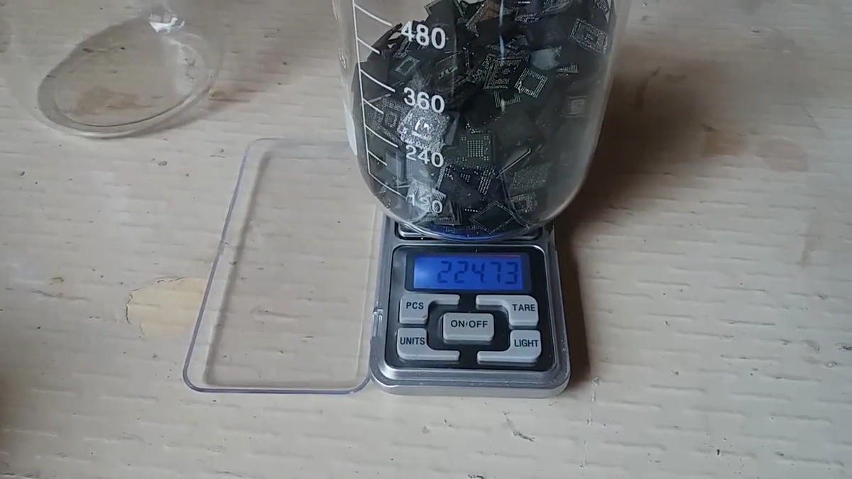 Друзья! По зиме нашёл целый мешок старых сотовых телефонов более 400 штук. С плат снял почти 225 грамм больших чипов VGA более 10 миллиметров на сторону. Буду извлекать из них золото, процесс жутко увлекательный, есть свои нюансы о них поведаю позже! Стакан с чипами на весах. На чипах много припоя, в котором ещё содержится небольшой процент серебра. Серебро конечно не так интересно как золото, можно и его будет попутно забрать из раствора. Припой будет мешать поэтому его уберу азотной кислотой. Поместил чипы в обычную банку, налил азотную кислоту, аккуратно помешивая палочкой из стеклопластика от кивка удочки. Неплохо держит кислоту, рекомендую. Должен напомнить читателю о технике безопасности при работе с кислотами, обязательно защитные очки, перчатки и подобную работу проводить на улице или под мощной вытяжкой. Спустя примерно час получаю такой результат, припоя нет. Кидаю на весы. Из почти 225 грамм осталось 207 грамм, нормально так ушло припоя и сопутствующего металла.
