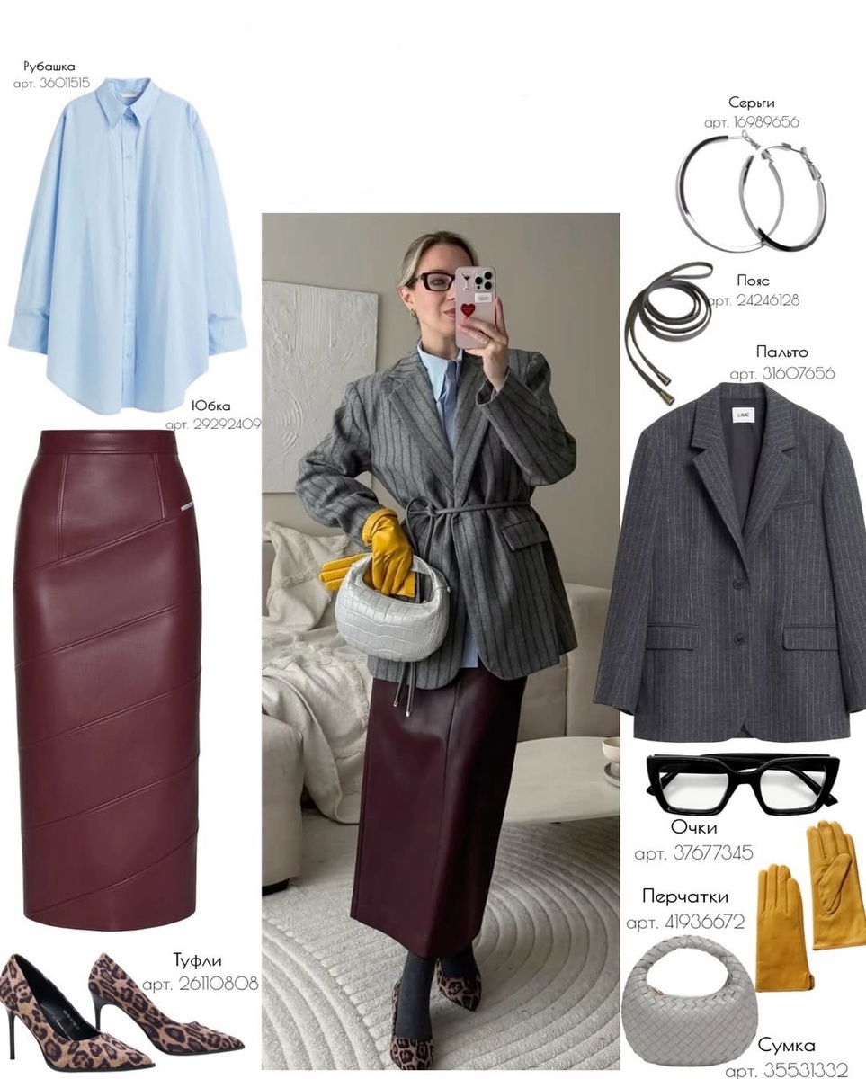 Серый пинстрип — универсальная «рабочая лошадка», а бордо — самый благородный осенний акцент. Горчичные перчатки собирают картинку, а леопард на лодочках дает ровно одну «дерзкую» ноту — этого достаточно.