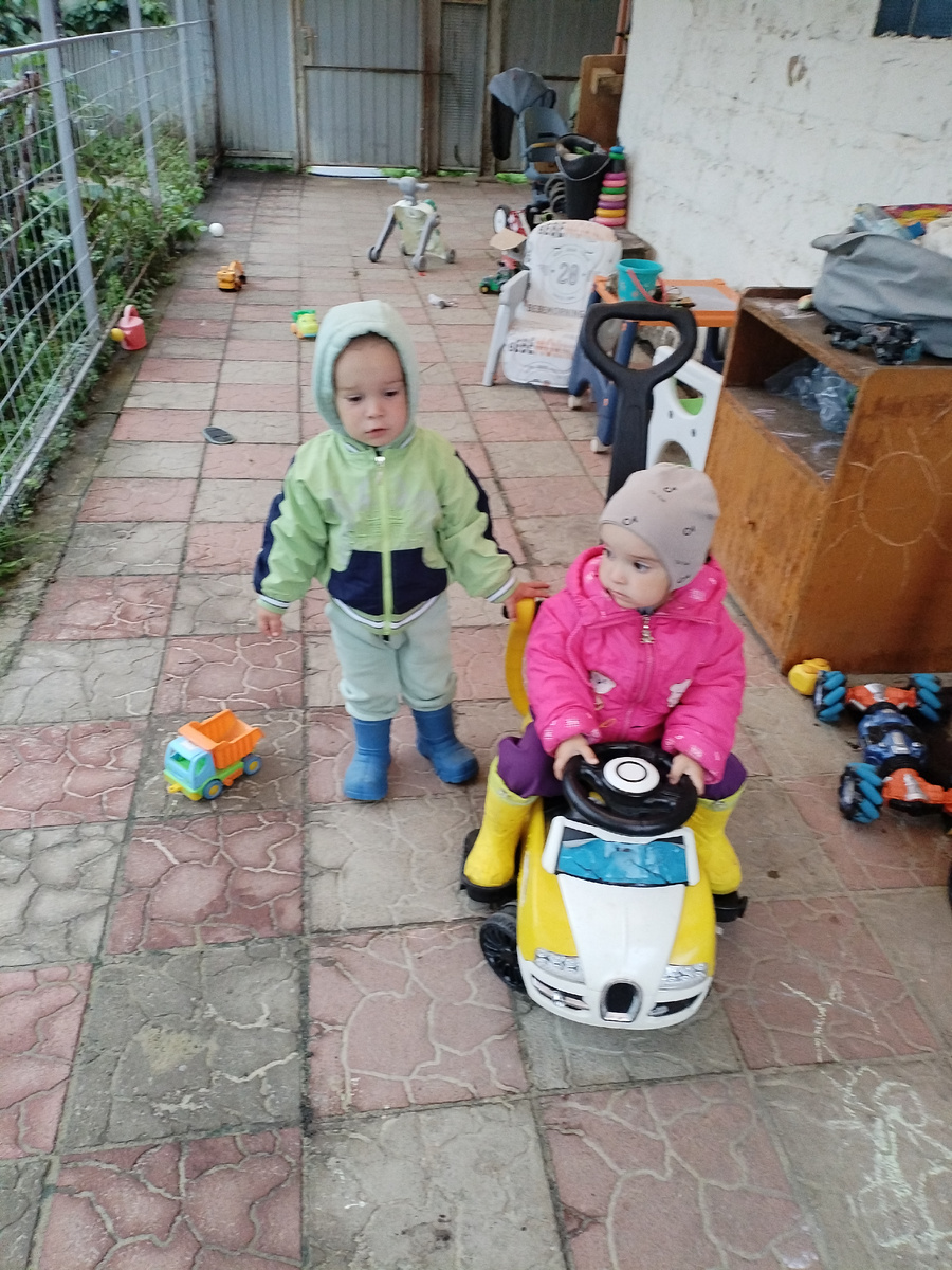 Скушали все, что достали. Дед две горсти им нарвал, скушали. И опять туда. Когда поняли, что лавочка закрыта, отправились играть. Амелька за метлу сразу ухватилась. Сказала: "Лузи. Аметать" (Лужи. Подметать). Хозяюшка. Везде порядок должен быть.