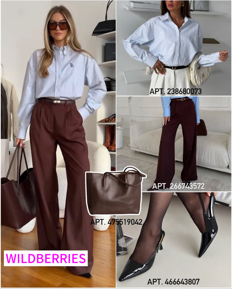 - Брюки прямые, мягкий тауп — WB: 238555489. Высокая посадка, стрелки, комфортный пояс.