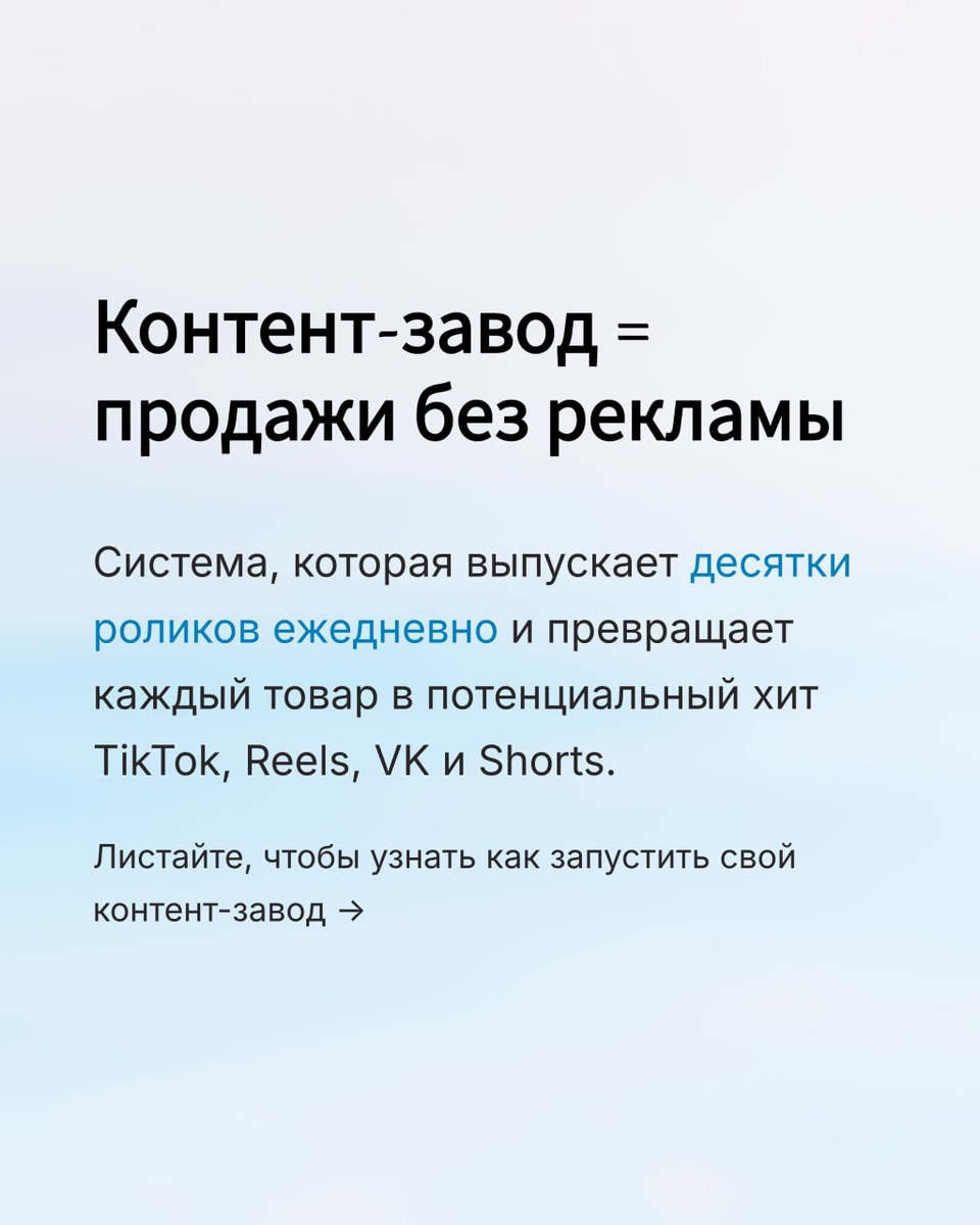 🛒 Контент-завод = продажи без рекламы. 🎬 Ежедневные ролики с обзорами, акциями и отзывами разгоняются алгоритмами TikTok, Reels, VK и Shorts. 📈 Товары получают десятки бесплатных шансов попасть в тренды и увеличить продажи в 5 раз. 👉 Хочешь Контент-завод под свой магазин? Пиши в ЛС или в Telegram → @chimitdorzhi