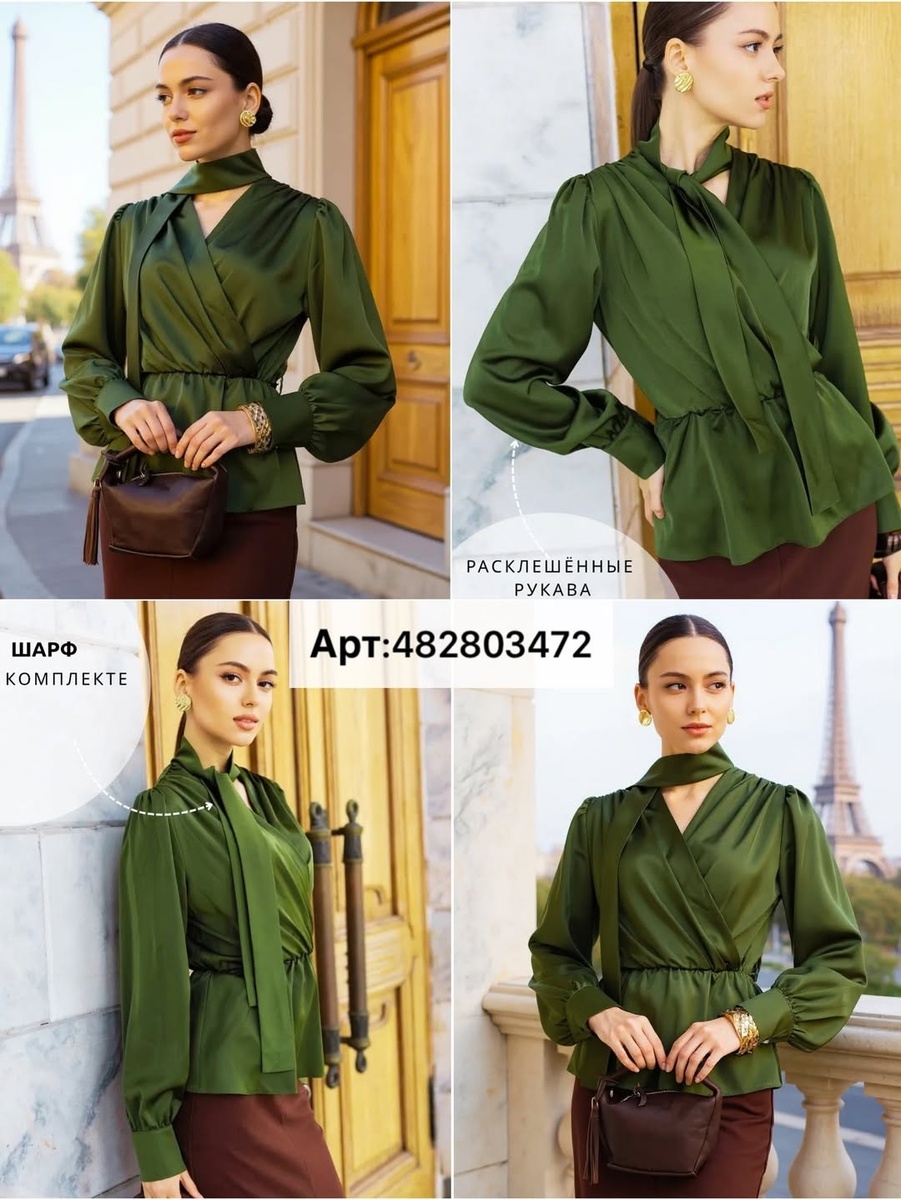 Что это: струящаяся блуза в благородном изумрудном оттенке с запахом, мягкой резинкой по талии и съемным шарфом-лентой. Рукава — слегка расклешённые с манжетой, посадка комфортная, ткань с деликатным шёлковым блеском.