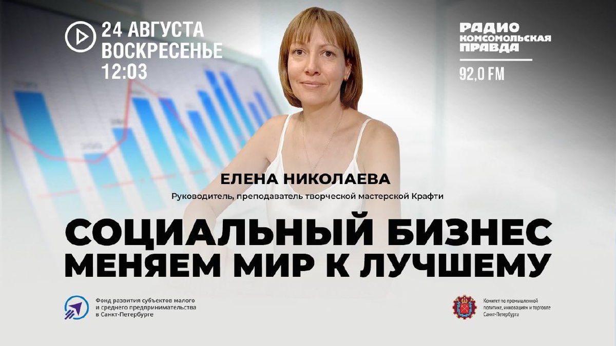 Слушайте новую программу «Социальный бизнес. Меняем мир к лучшему» на Радио «Комсомольская правда в Петербурге» 92,0 FM в воскресенье, 24 августа, в 12:03.