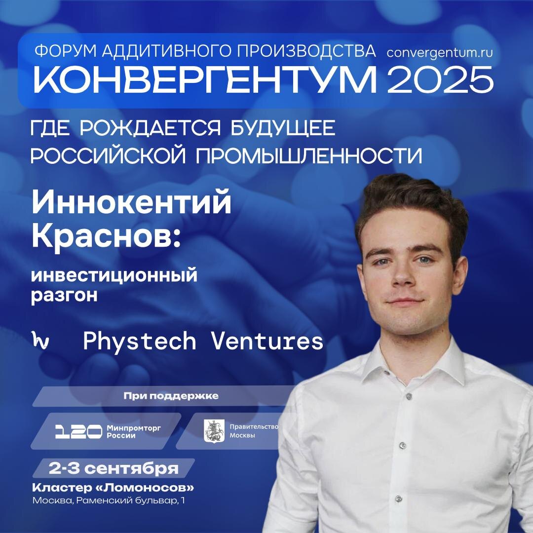 Иннокентий Краснов: инвестиционный разгон 👤 Отличная новость для стартапов и инноваторов в аддитивных технологиях! Панельную дискуссию «Инвестиционный разгон» на форуме аддитивного производства «Конвергентум 2025» одарит своим вниманием Иннокентий Краснов, инвестиционный ассоциат Phystech Ventures. Иннокентий принесет на дискуссию не просто теорию венчура, а глубокую практику инвестиций в сложные DeepTech-сектора, включая аддитивные технологии, с более чем пятилетним опытом работы с проектами в России и за рубежом. Он напрямую погружен в ваш мир: его уникальная ценность – в результатах общения с более чем 15 ведущими экспертами по АТ как в России, так и на глобальном уровне, что дает ему актуальное понимание трендов, вызовов и возможностей рынка. Особенно полезным будет его опыт проведения глубокого анализа рынка 3D-печати в промышленности. И самое главное – Иннокентий приходит с конкретным инвестиционным интересом к российским проектам в технологических сферах прямо сейчас, а это