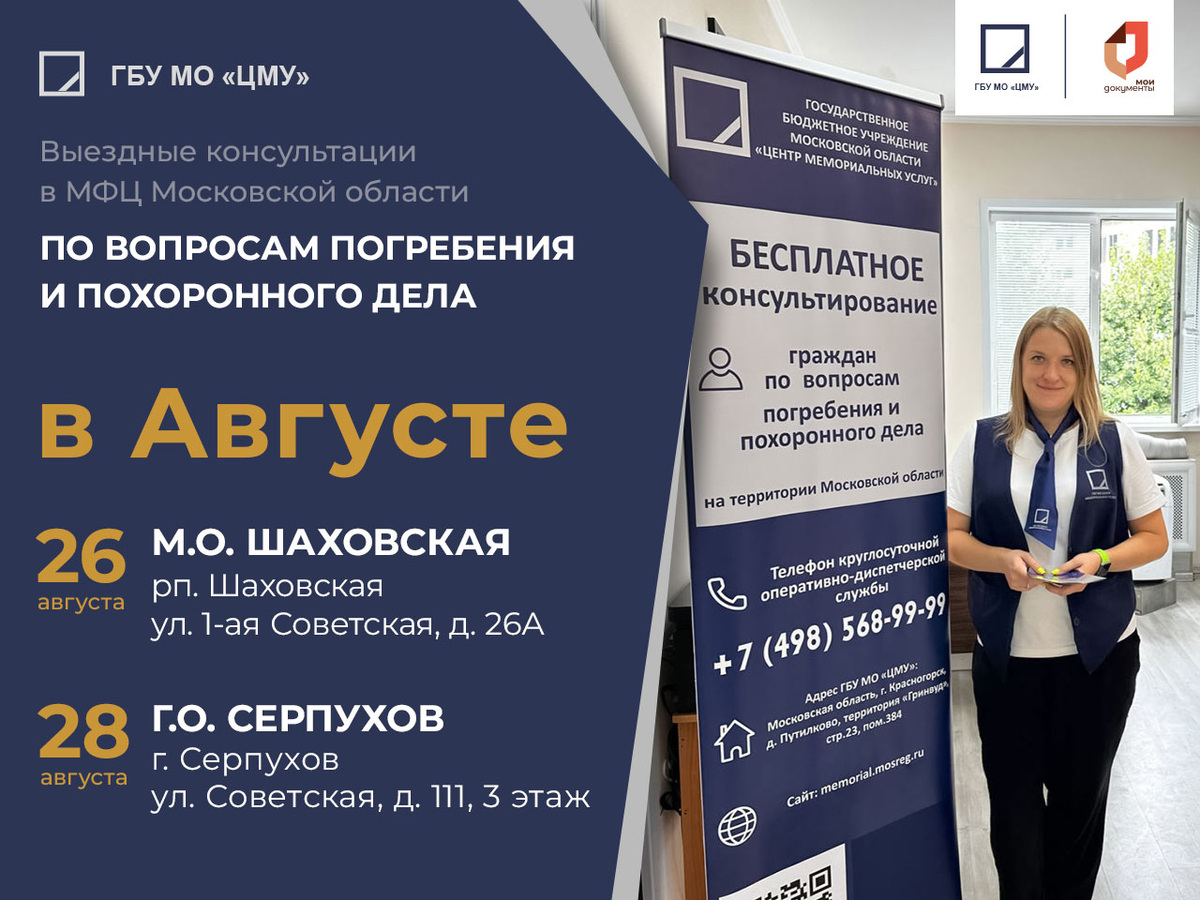 Спешите получить консультацию в МФЦ вашего города, согласно графику выездов, от специалистов ГБУ МО «Центр мемориальных услуг». Если вы хотите узнать о законодательстве в сфере погребения и похоронного дела - приходите в МФЦ на консультацию. Наши специалисты ответят на все интересующие вас вопросы. Запланированные выезды: 26.08.2025 МФЦ, Московская обл., м.о. Шаховская, рп. Шаховская, ул. 1-ая Советская, д. 26А 28.08.2025 МФЦ, Московская обл., г.о. Серпухов, г. Серпухов, ул. Советская, д. 111, 3 этаж Также получить бесплатную консультацию в сфере погребения и похоронного дела можно удаленно, обратившись на круглосуточную горячую линию