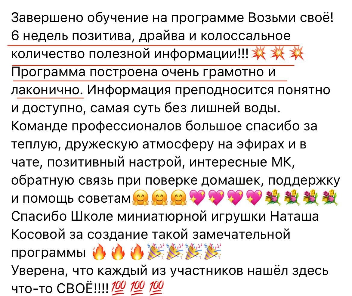 🔥 «Возьми своё» — старт нового потока! «Завершено обучение на программе Возьми своё! 6 недель позитива, драйва и колоссальное количество полезной информации! Программа построена очень грамотно и лаконично.» Юлия Сибагатулина «Каждый эфир приносил что-то новое. Добавлял уверенности, помогал "включить продавца" (это я себе такой термин придумала после эфира по продажам).» Надежда Челпан «Было очень интересно. Люблю учиться и узнавать что то новое. Мы работали над портфолио рукодельного мастера, над совершенствованием навыков создания фото и видео, познакомились с секретами тайм менеджмента, как продвигаться в соцсетях, и много еще нужного и полезного.» Людмила Хантаева Так говорят наши выпускницы о курсе «Возьми своё». 6 недель поддержки, драйва и знаний, которые помогают вывести творчество на новый уровень 🌟 📌 В новом потоке вы получите: — пошаговую систему продаж и продвижения, — портфолио мастера, которое работает на вас, — уютное сообщество и атмосферу, где хочется расти. 🎁