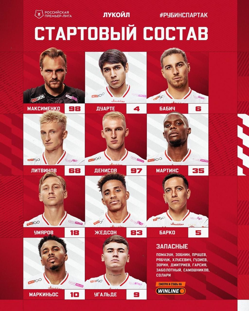 Составы на матч ⚽️Рубин-Спартак⚽️ 0:2 в пользу Спартака