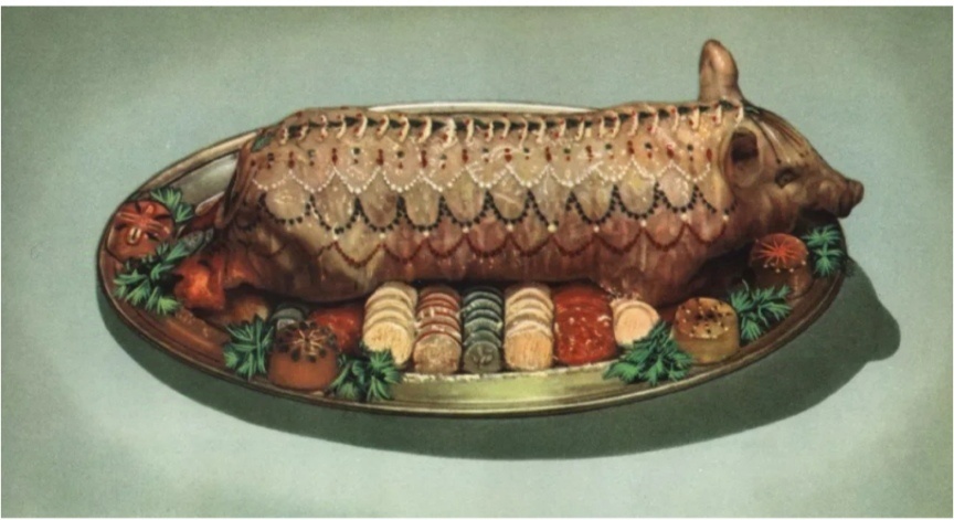Нам понадобится : На 1 поросёнка весом 2-2,5 кг - 30 гр желатина , по 1 шт моркови , петрушки и 1 головку лука. Поросёнка ошпарить, опалить, выпотрошить и промыть. Перед варкой разрубить его на части: отделить голову, тушку в почечной части разрезать поперек (каждую половину можно дополнительно разрубить вдоль по позвоночнику). Положить поросёнка в кастрюлю , залить холодной водой , добавить очищенные коренья и лук и поставить варить , накрыв кастрюлю крышкой . Лучше сварить поросёнка в целом виде в кастрюле или в длинном котелке. В этом случае позвоночную кость у шеи надо разрубить с внутренней стороны до мякоти. Когда вода закипит, снять пену и продолжить варить на слабом огне в течение 40-50 минут. За 10-15 минут до готовности посолить. Готового поросёнка охладить в том бульоне , в котором он варился, после чего вынуть его на блюдо. Бульон , полученный при варке поставить на огонь, добавить перец, лавровый лист , гвоздику и дать закипеть; затем положить желатин,