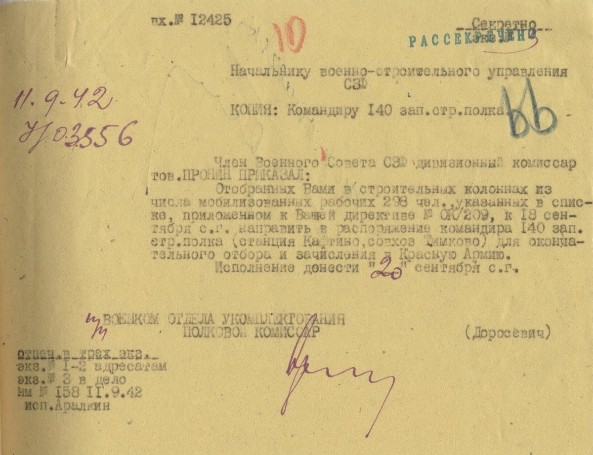 Сегодня в нашей уже постоянной рубрике новая находка. Во время очередного поиска для нашего клиента мы работали с нарядами запасным полкам и пересыльному пункту на отправку рядового и младшего начсостава по Северо-Западному фронту в сентябре-декабре 1942 года. Искомой информации наш специалист там не обнаружил (но нашел в другом деле), зато его внимание привлек список рабочих из рабочих колонн Военно-строительного управления Северо-Западного фронта. Их предполагалось в сентябре 1942 года отправить в 140-й запасной стрелковый полк, а далее после обучения на фронт. Это, скорее, предварительный список: далее люди должны были пройти отбор по здоровью и моральным качествам – как стоит в резолюции, надо было отобрать «людей здоровых и политически не вызывающих сомнений». В любом случае, возможно, кто-то найдет в этом списке информацию о своем пропавшем родственнике или сможет получить новые данные для восстановления боевого пути своего прадеда.