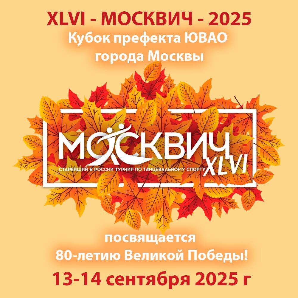 🏆 ХLVI-МОСКВИЧ-2025. Кубок префекта ЮВАО города Москвы. 13-14.09.2025 г. сб-вс Турнир посвящается 80 летию Великой Победы! 🎓 Организатор ТСК «Алеко» КЦ «Москвич», Галина Борисовна Гулай. 🧭 Место проведения Москва, Дворец Борьбы имени Ивана Ярыгина. 🚕 Проезд м. Авиамоторная ул. Авиамоторная д. 40. 📝 Регистрация - по квалификационным книжкам, паспортам или свидетельствам о рождении, медицинским справкам, договорам о страховании несчастных случаев. - в день соревнования: только при наличии свободных мест. 🔗 https://dance.vftsarr.ru/reg_module/?mode=registration&competition_id=799