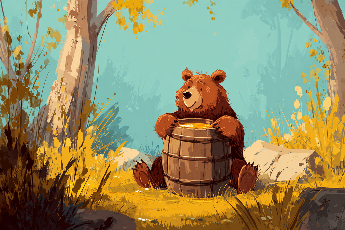 Жил в лесу маленький медвежонок по имени Буся. Он был добрый, но иногда становился очень жадным. Особенно если дело касалось мёда. Однажды он гулял по лесу и вдруг увидел у старого дуба большой-большой бочонок мёда. Мед так сладко пах, что у Буси сразу забурчало в животе. — Ого! Целый бочонок! — обрадовался он. — Это всё для меня! Я никому не расскажу, сам всё съем! Буся попробовал поднять бочонок… но тот был такой тяжёлый, что лапы у него дрожали, а спина затрещала. Он пыхтел, тянул, толкал — ничего не вышло, ведь медвежонок был еще мал, чтобы утащить такой бочонок меда. Тут мимо прыгала белочка. — Буся, что ты делаешь? — спросила она. — Ничего! — быстро ответил медвежонок, прикрывая бочонок собой. Но белочка уже почувствовала запах мёда. — Давай помогу? А за это ты угостишь меня медом. Буся замялся… и тут подошёл заяц, потом ёжик, потом даже лиса. Все принюхались и сказали: — Давай вместе потащим! А потом все вместе угостимся медком. Буся понял: одному ему не справиться. Он нехотя к