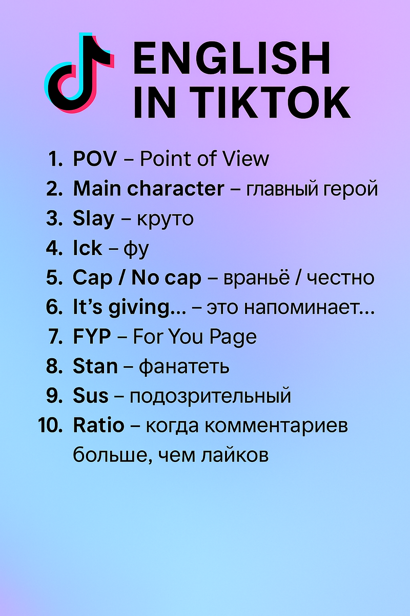 Эти слова — не просто сленг. Они помогают понимать культуру, настроение и стиль общения современного поколения. Даже в учебниках английского такого не найдёшь, а значит, TikTok — это настоящий «живой учебник языка».