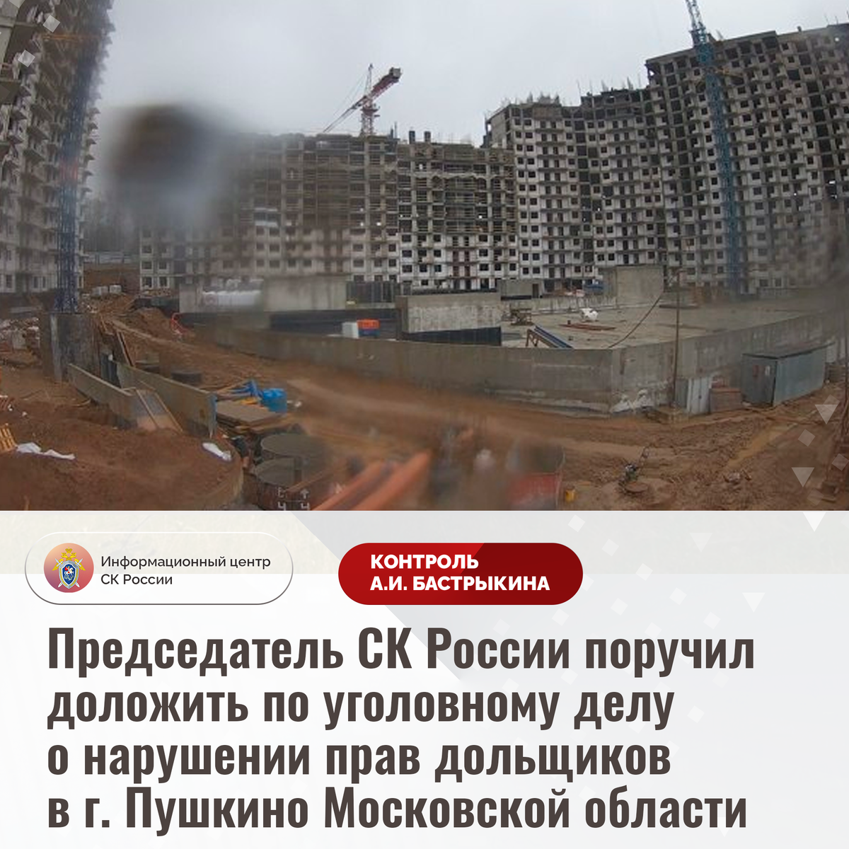 Председатель СК России поручил доложить по уголовному делу о нарушении прав дольщиков в г. Пушкино Московской области К Председателю СК России А.И. Бастрыкину через Информационный центр обратились участники долевого строительства ЖК «Южное Пушкино» в микрорайоне Мамонтовка города Пушкино Московской области по вопросу нарушения их прав. Возведение многоквартирных домов начато ООО СЗ «АПСИС СТРОЙ» более девяти лет назад, однако до настоящего времени работы не завершены, срок ввода объектов в эксплуатацию постоянно переносится. При этом компанией не организованы надлежащие условия для хранения отделочных материалов, из-за чего они утратили потребительские свойства. Многочисленные обращения пострадавших, вынужденных проживать в арендованном жилье и оплачивать ипотеку, в различные инстанции результатов не принесли. Ситуация освещалась в социальной сети. В ГСУ СК России по Московской области возбуждено уголовное дело. Председатель Следственного комитета Российской Федерации Александр Иванови