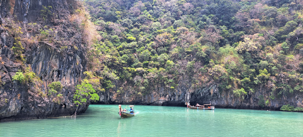 Привет, друзья! В предыдущей статье я рассказывала про остров Hong и почему там невозможно заскучать. И одно из мест, которое не оставит к себе никого равнодушным-это его лагуна. Находится она на севере острова, куда ведёт вот такой узкий канал. Несколько суден одновременно по нему точно не пройдут. Наш катер занял собой весь проход. Как только в неё заплываешь, не понимаешь на чём остановить свой взор. Со всех сторон её окружают величественные известняковые скалы, покрытые зеленью. По ней можно поплавать на лонгтейлах, каяках и катерах. Местность невероятно гористая. Никто в воде не купается и не снорклит, как в лагуне Пеле. Она конечно на мой взгляд уступает той лагуне, но безусловно по своему хороша. Вода здесь не такая прозрачная, но в этом тоже есть некий тайский шарм. Деревья на воде создают какую-то магическую атмосферу. Вода здесь от молочно-голубого цвета до глубокого изумрудного. Определённо есть на что посмотреть. Очень величественно и при этом невероятно уютно. Всё вокру