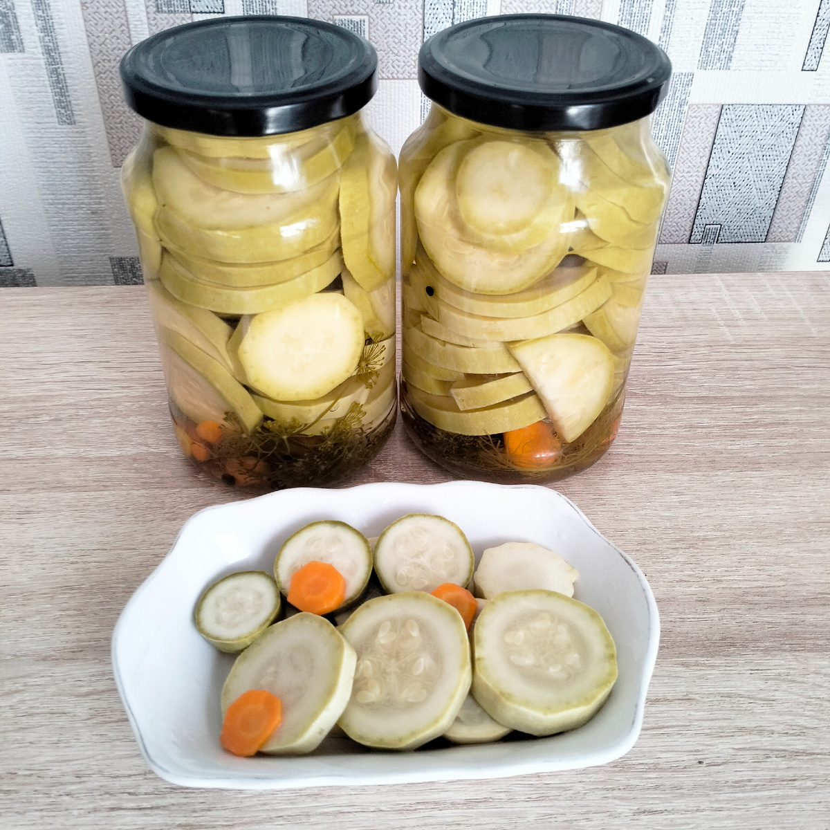 Сезон кабачков начинается с весны и заканчивается аж осенью. У нас достаточно времени, чтоб сделать из них множество вкусных заготовок. И каждая хозяйка хоть несколько баночек, но заготавливает обычных маринованных кабачков кружочками. Очень много рецептов я перепробовала, но всегда мне чего-то в них не хватало. Нашла я в старых бабушкиных записях рецепт, сделала и поняла - вот оно, то, что я искала! Поделюсь рецептом с Вами. Рецепт на 3 литровые банки: Кабачки - 1,5 - 2 кг; Маринад: 1,5 л воды; 180 г сахара 180г уксуса 50г соли Укроп, чеснок, черный перец горошек, горчица в зёрнах или французская, морковь. Молодые кабачки, промываем, обрезаем носик и хвостик и нарезаем кружочками толщиной 6-8 мм. Если кружок получается большой в диаметре, разрезаем его пополам на полудольки. В подготовленные банки, на дно каждой, кладём зонтик укропа (если нет, то можно или семена, или зелёные веточки), несколько зубчиков чеснока (разрезанных пополам), 5-8 горошин черного перца, 1 чайную ложку франц