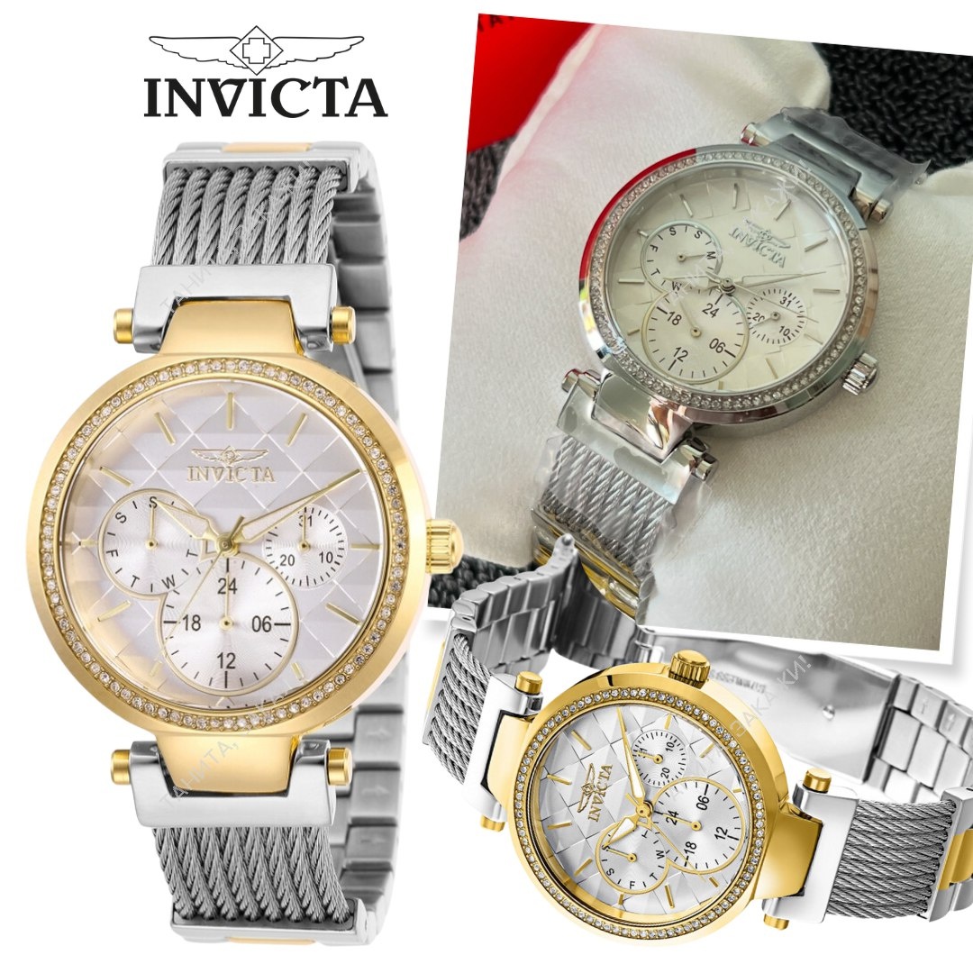 Водонепроницаемость до 100 метров. Корпус из нержавеющей стали оттенка желтого золота с браслетом из нержавеющей стали. Фиксированный безель оттенка желтого золота с кристаллами.