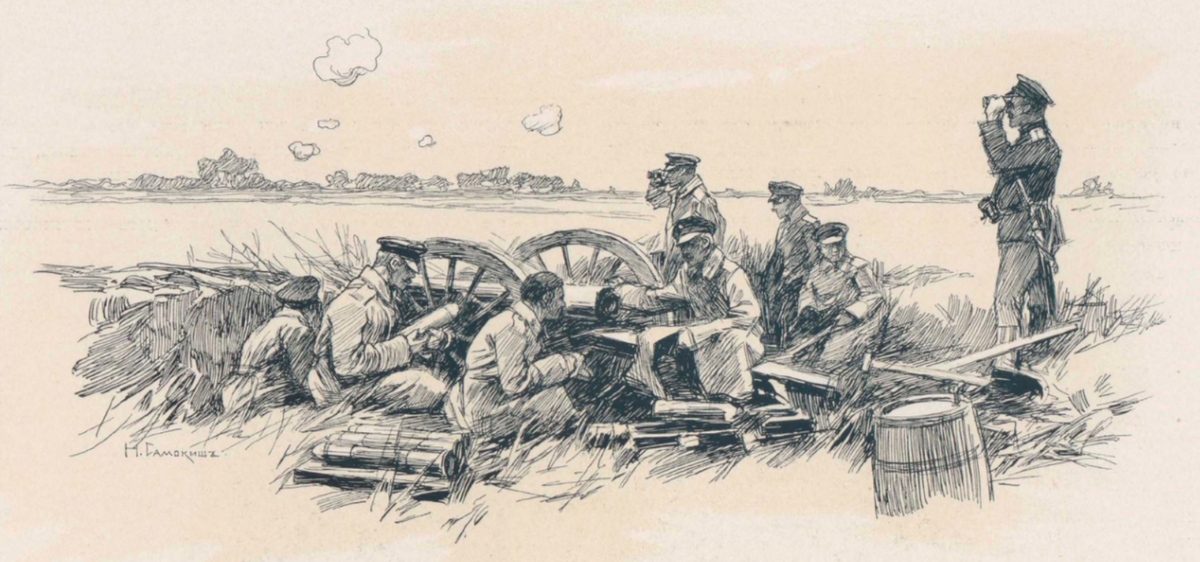Перейдя на эту сторону Шахэ, я направился к нашей батарее сообщить офицерам о результате стрельбы и выпить обещанного какао. Мон новые знакомцы ждали меня, и мы все гурьбой, усевшись на бурку, стали говорить о теперешней роли артиллерия в бою. В это время солдатик принес горячее какао, и я уже предвкушал удовольствие выпить этого укрепляющего напитка после целого дня ходьбы в усталости. Мне налили стакан, и я проткнул руку, чтобы взять свою порцию; вдруг послышался резкий шипящий и визжащий звук, и бризантный снаряд ударил в земляной вались перед нашим орудием раздался взрывы, шуршание осколков, клуб буро-черного дыма поднялся вверх вместе с комьями земли, полетевшими во все стороны и опрокинувшими и мой стакан и весь какао. Раздалась команда: «По местам!» Офицеры бросились к своим орудиям.