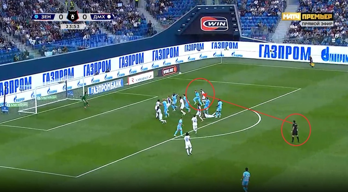 Зенит-Динамо Мх 25 мин. Правильное решение принимает арбитр ВАР Буланов и приглашает на просмотр пропуска на не назначения 11-м удара. Игрок №13 команды Динамо Мх задерживает игрока команды Зенит №25 Правильное решение принимает Кукуян и меняет решение и назначает 11-м удар. Оценка арбитру будет снижена на - 0,5 балла, так как арбитр мог улучшить позицию.