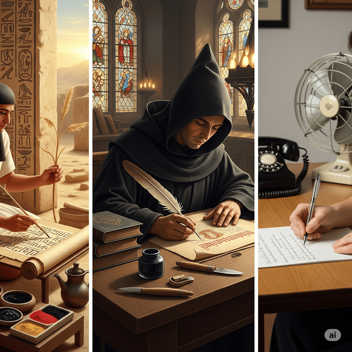 Древний мир: когда письмо было ремеслом История письма — это история человечества. В древности письмо было не просто способом передачи информации, а сложным, почти сакральным ремеслом. Месопотамия (около 3500 г. до н.э.) Инструменты: Основным инструментом был стилус — заостренная палочка из дерева или тростника. Материал: Писали на глиняных табличках. Стилусом выдавливали клинописные знаки, пока глина была мягкой. Затем таблички высушивали на солнце или обжигали в печи, что делало их невероятно долговечными. Влияние: Такая система была громоздкой и медленной. Поэтому грамотными были только писцы, которые проходили многолетнее обучение. Это делало письмо привилегией и инструментом власти. Древний Египет (около 3100 г. до н.э.) Инструменты: Египтяне использовали каламус — тонкий тростниковый стебель. Его кончик расщепляли, чтобы он работал как кисточка. Материал: Главным материалом был папирус, который делали из стеблей одноименного растения. Для письма использовали чернила, кото