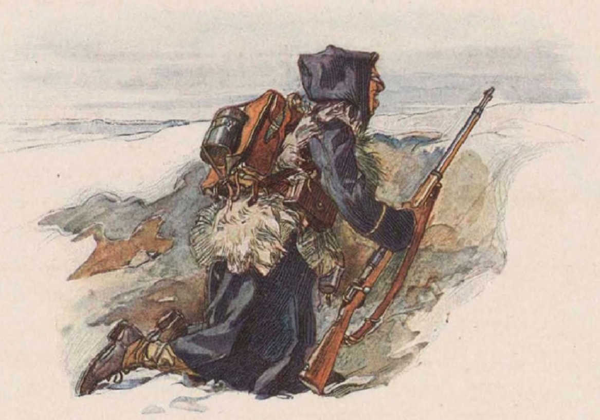 Испытав, как трудно работать на морозе, я решил, что этюдов на открытом воздухе мне не придется больше делать, а так как я уже все осмотрел, то и нужно было возвращаться домой. Вечер приближался, а ехать нужно было далеко, поэтому я, распростившись с любезным хозяином, сталь собираться ехать в Чансамутунь. Но тут явилось затруднение: князь Радзивилль еще вчера жаловался на нездоровье, а сегодня быль совсем болен и лежал в соседней землянке, у знакомого офицера. Я пошел в землянку и уговаривал князя остаться, пока ему будет лучше; он, очевидно, простудился, и было бы опасно ехать 20 верст верхом по морозу.