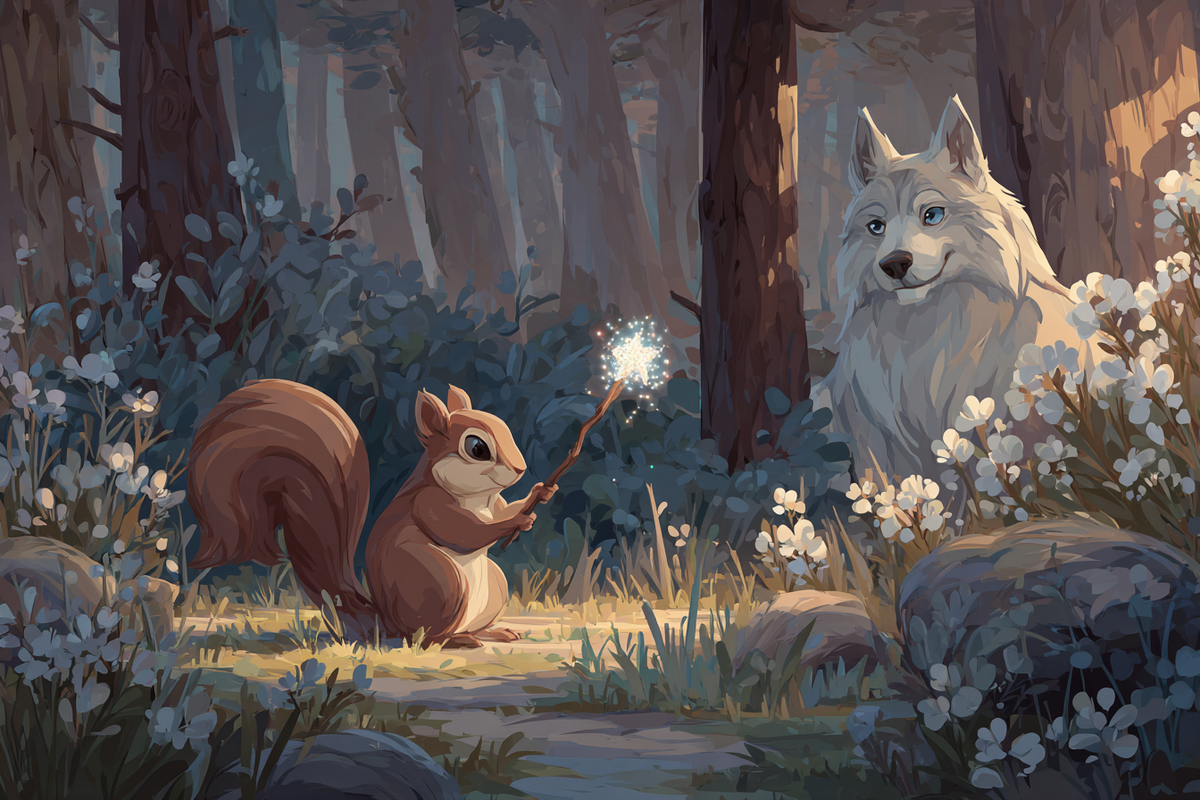 Жила-была маленькая фея по имени Мая. Она была юной и очень доброй. У неё была волшебная палочка, которой она помогала цветам расти, птичкам петь и даже радуге появляться после дождя. Но однажды Мая летала по лесу и нечаянно уронила свою палочку прямо в траву. Она искала и искала её, но не могла найти и заплакала от грусти. А потом феи пришлось вернутся домой, потому что наступала ночь. На следующее утро мимо пробегала Белочка. Она заметила среди листьев блестящую палочку и подняла её. — Ах, какая красивая! Наверно, маленькая фея потеряла ее. — сказала Белочка. — Но я должна вернуть её хозяйке. И только она собралась отправиться на поиски феи, как из кустов вышел Серый Волк. Его глаза хитро сверкнули. — Отдай палочку мне! — зарычал он. — С её помощью я стану самым сильным и буду править всем лесом! Белочка спрятала палочку за спину и твёрдо ответила: — Нет! Эта палочка создана для добра. Она принадлежит фее, а не тебе. Волк захохотал и побежал за ней. Белочка прыгнула на дерево, пере