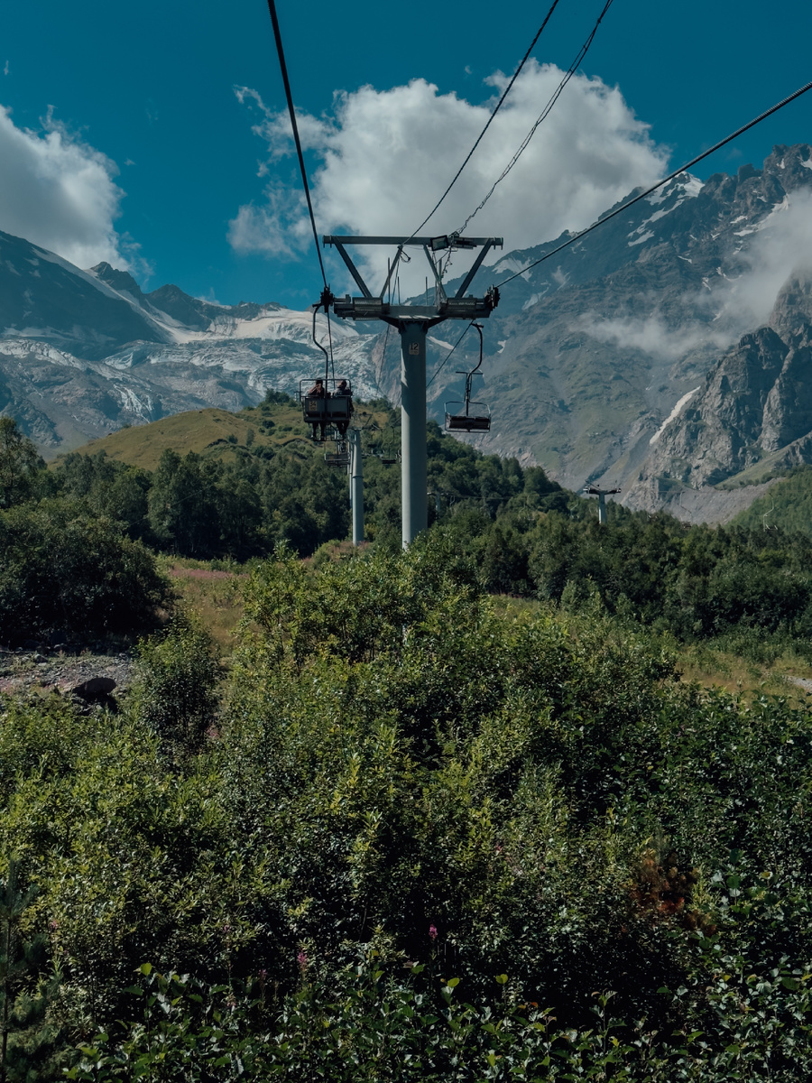Выбрали туда идти в первый день. Поднимались на канатке, дальше - пешком. Да, это было верное решение, т.к. сейчас ледник выглядит уже не так живописно, как несколько лет назад. И такой маршрут лучше поставить в начало. Плюс идти от подьемника нужно прилично и до самого ледника вы не дойдёте. Мы дошли до сюда 42.759365, 43.889329 Подьемник работает с 10 (по факту только около 10.30 начал) до 15.30, стоит 800р, лучше берите наличку, карточкой я не смогла оплатить. От подъёмника вверх по гребню идёт тропа, заблудиться невозможно. Мы прошли максимально вверх сколько могли по сыпухе. Дальше уже я бы одевала каску, да и в кроссовках бы не шла. Мы развернулись назад. Виды красивые, но не ожидайте многого от ледника.