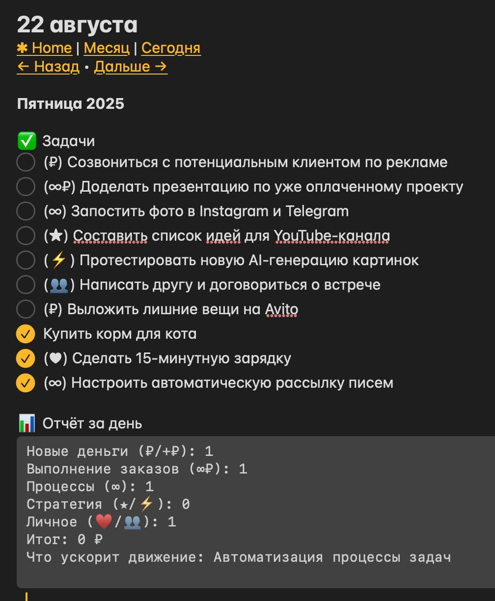 У меня есть главная страница с месяцами, в каждом месяце — список дней. Есть навигация: Назад → во вчера, Дальше → в завтра. И каждый день открываю отдельную заметку «Сегодня». Главная фишка — система символов. Вечером я подвожу отчёт — в цифрах, без воды: сколько задач сделал, сколько денег пришло, что сделал для себя. Оказалось, что такой способ работает лучше, чем сложные менеджеры. Потому что простота всегда выигрывает.