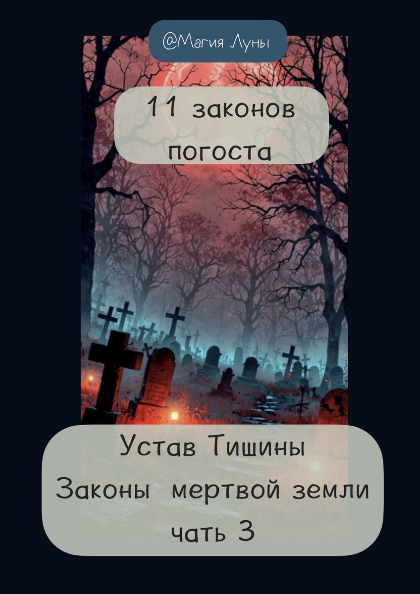 🌑 Устав Тишины Законы мертвой земли часть 3 11 законов погоста как вести себя кладбище 🌑 Слушай внимательно слова кладбищенские, что шёпотом переходят от старых ведьм к молодым… 🖤1— Не читай года на памятниках. Счёт чужой жизни — то не твой счёт. Прочтёшь — украдёшь у себя век, будто ниточку от собственной судьбы выдернешь. 🖤2 — Не трогай на чужих могилах вещей. Камни, еда, цветы, обувь — не твои они. Камень кладут, чтоб замкнуть могилу, а обувь — зов усопшего за собой. Возьмёшь — примешь чужую дорогу. 🖤3 — Памятник — то не камень, то дверь. Маленький проход в загробное. Не касайся его, не смотри прямо в глаза на фотографиях 🖤4- Фото — глаза мёртвого, а глаза всегда видят Не смори в глаза 🖤5 — Не проходи меж двух ангелов. Это врата не для тебя не для живого. 🖤6 — Не бери иголки и острые предметы на могилах. Они — ключи и замки для иных дел, и тебе их касаться нельзя. 🖤7 — Когда уходишь, коснись ладонью холодного металла — ворот, ограды Так закроешь за собой прохо