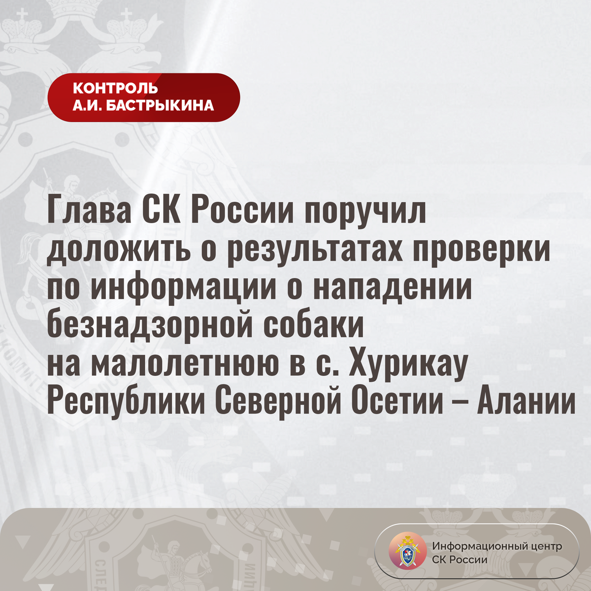 Глава СК России поручил доложить о результатах проверки по информации о нападении безнадзорной собаки на малолетнюю в с. Хурикау Республики Северной Осетии – Алании В сети Интернет сообщается, что 20 августа текущего года в селе Хурикау Республики Северной Осетии – Алании безнадзорная собака набросилась на малолетнюю, укусив за руки и ноги. Пострадавшей потребовалась медицинская помощь. В СУ СК России по Республике Северная Осетия – Алания по данному факту организована процессуальная проверка. Председатель Следственного комитета Российской Федерации Александр Иванович Бастрыкин поручил и.о. руководителя СУ СК России по Республике Северной Осетии – Алании Василию Васильевичу Сироткину доложить о ходе и результатах процессуальной проверки. Исполнение поручения, а также ход процессуальной проверки поставлены на контроль в центральном аппарате ведомства. #СледственныйКомитет #СКРоссии #СКР #ИЦСКР #ИнформационныйЦентр #АлександрБастрыкин #ПредседательСКР #КонтрольПредседателяСКР #Комментари