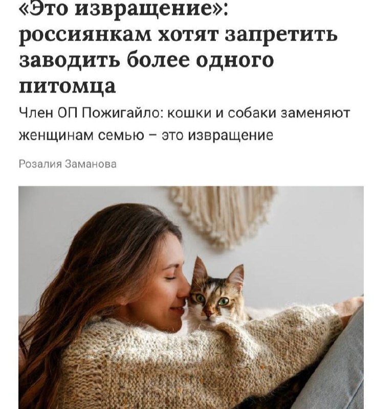 В Госдуме предложили запретить одиноким женщинам заводить больше одной кошки По мнению депутатов, привычка держать несколько животных противоречит семейным ценностям и пришла из-за рубежа: питомцы якобы заменяют женщинам семью. Такой образ жизни депутаты предлагают ограничить. Заря | Новости - Подписаться