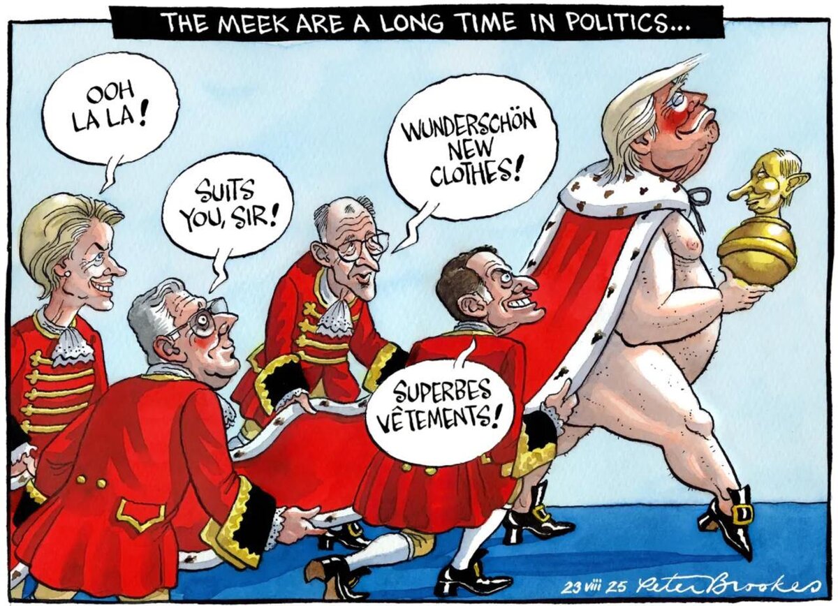 The Times sketches the EU delegation visiting Trump, a scene of impeccable sartorial splendor. “Oh-la-la!” “Sir, that suit suits you!” “Dressed to the nines,” they murmur, as if praising a fashion exhibit rather than a political gathering.