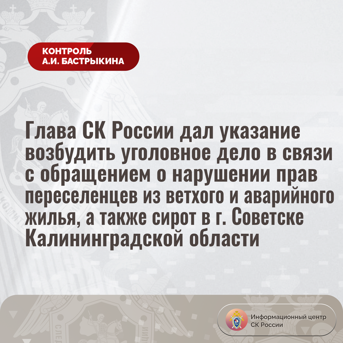 Глава СК России дал указание возбудить уголовное дело в связи с обращением о нарушении прав переселенцев из ветхого и аварийного жилья, а также сирот в г. Советске Калининградской области В комментариях в социальной сети СК России размещено обращение по вопросу нарушения прав переселенцев из ветхого и аварийного жилья, а также сирот из города Советска Калининградской области. Ранее нуждающимся были предоставлены жилые помещения в доме на улице Капитана Лямина, в ходе строительства которого допущены многочисленные нарушения. Так, мансардный этаж двух секций здания возведен без учета разрешенной этажности и проведения процедуры согласования. Стены выполнены из панелей, непредназначенных для использования при монтаже конструкций многоквартирных домов. В связи с этим жильцы опасаются разрушения строения. Обращения в различные инстанции результатов не принесли. В СУ СК России по Калининградской области организована процессуальная проверка. Председатель Следственного комитета Российской Феде