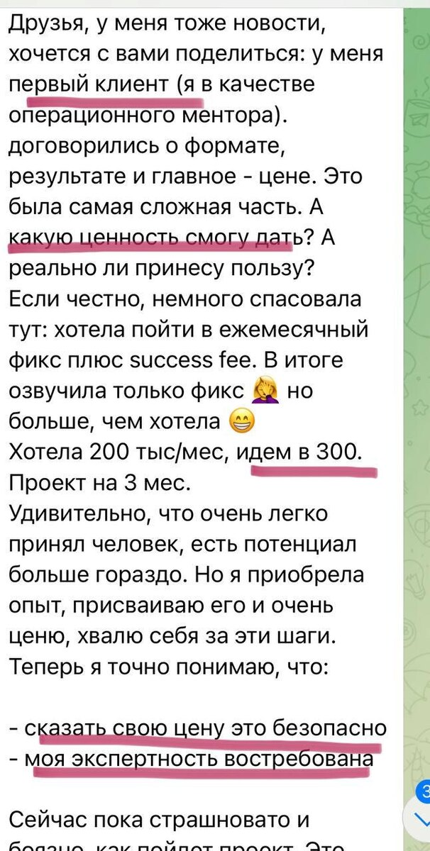 Хочу поделиться с вами для меня очень радостным - участники текущего потока программы «Сила бренда 11» уже получают классные результаты. А прошла только половина программы. С участницей с 0 определили ее экспертность и продукт - и вот результат: контракт почти на 1 млн🔥 Конечно, здесь сыграла ее смелость и активность. Никакой магии - только точные действия👌 *Сообщение из чата группы