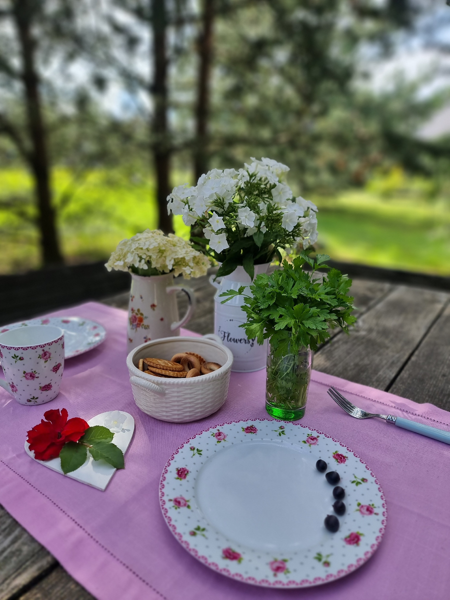 А в деревне раздолье! И места много, и посуды я поднакопила достаточно, и цветы всегда под рукой.